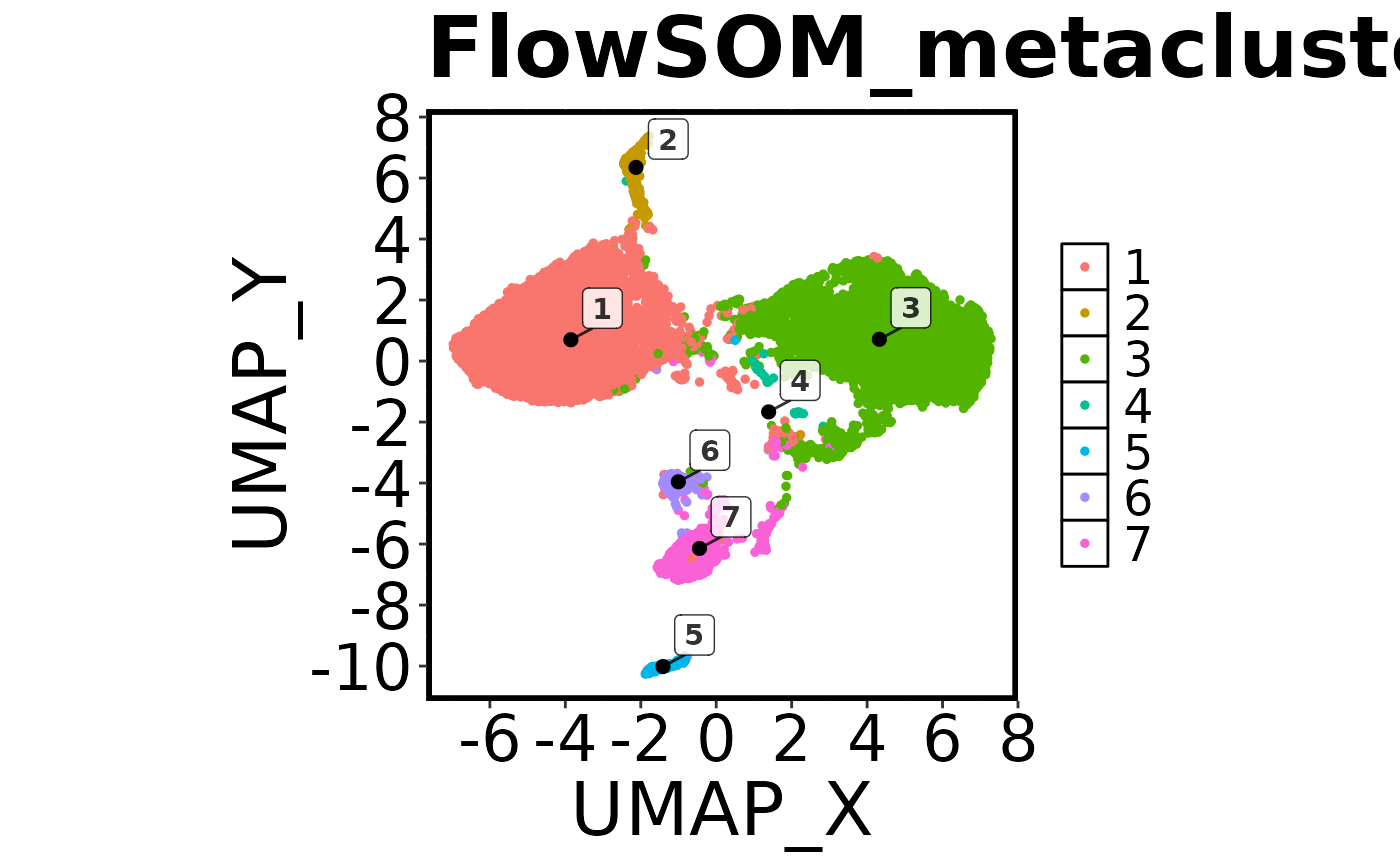 Now that we have run FlowSOM and UMAP, we want to do a quick visual check to make sure everything looks correct. To do this we are going to create a ‘factor’ plot – a dot plot with our two UMAP columns as the X and Y axis, and the FlowSOM_metacluster as the colour. We are going to add the labels of each cluster to the plot, and we will tell the function not to save the image to disk. Running this command should generate a plot in the viewer window in RStudio.