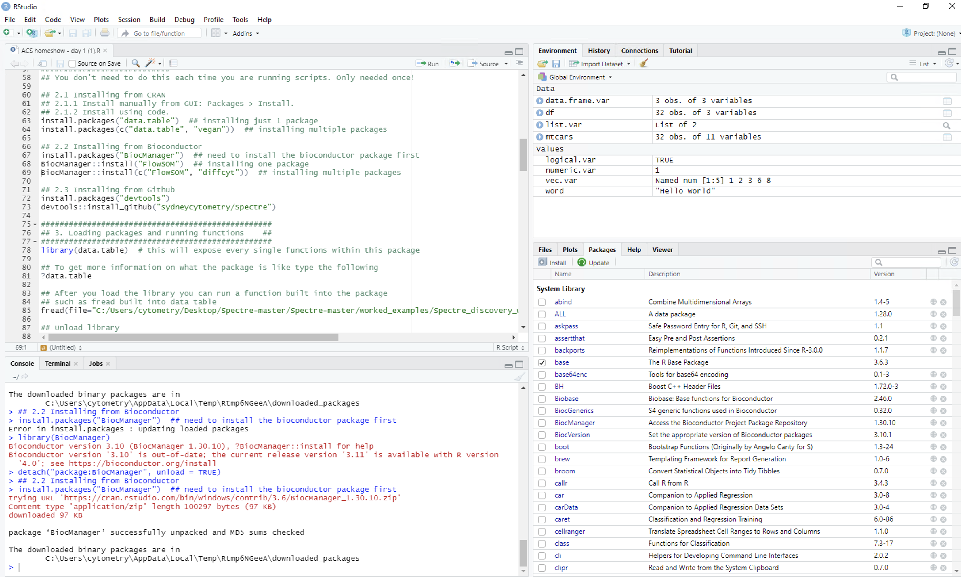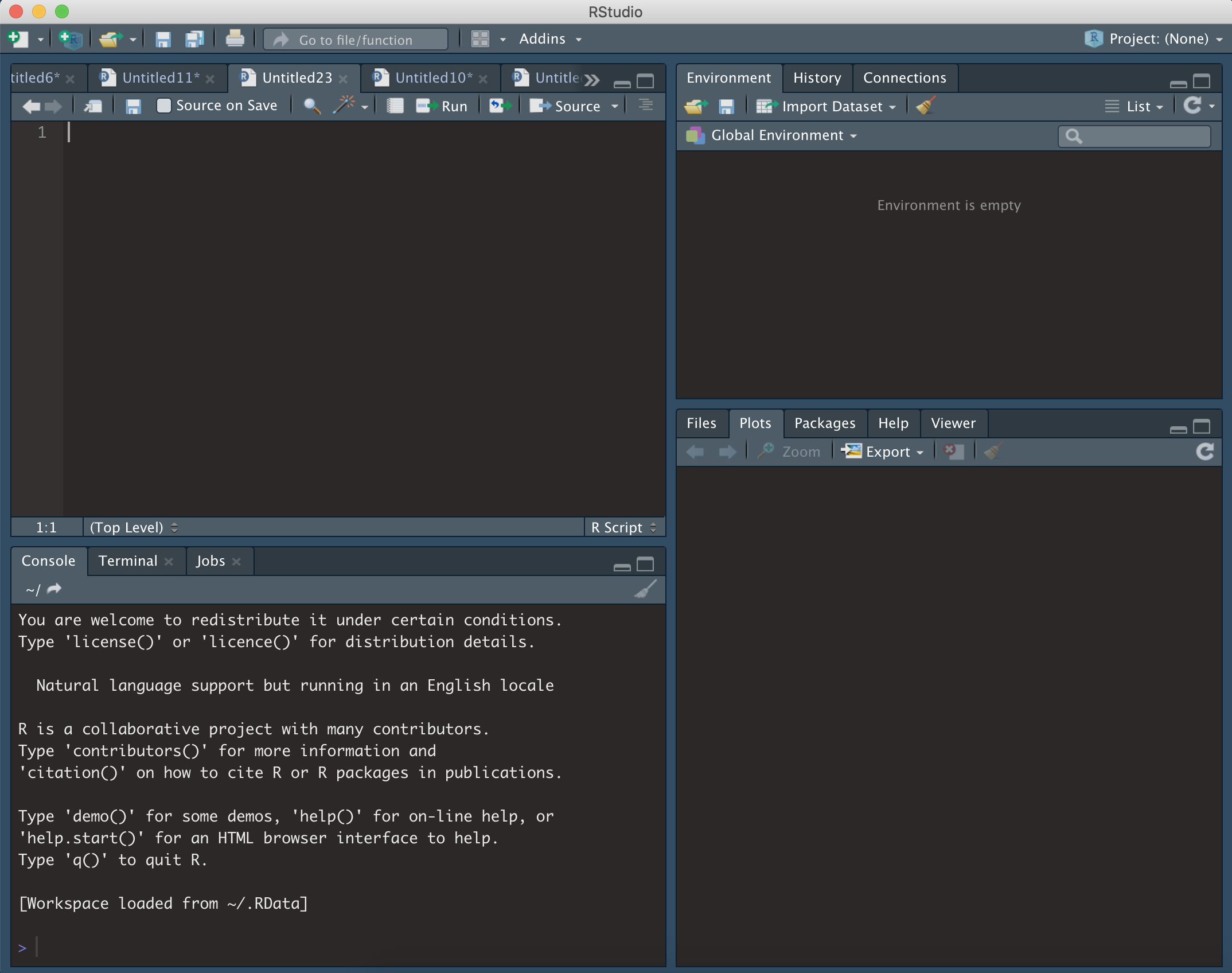- Bottom right = various. This is mainly used for displaying plots (under ‘Plots’), investigating the packages (‘Packages’), or using the help section (‘Help’).