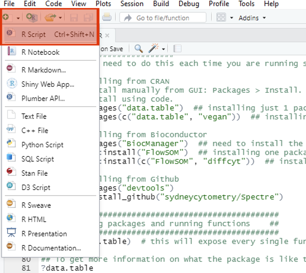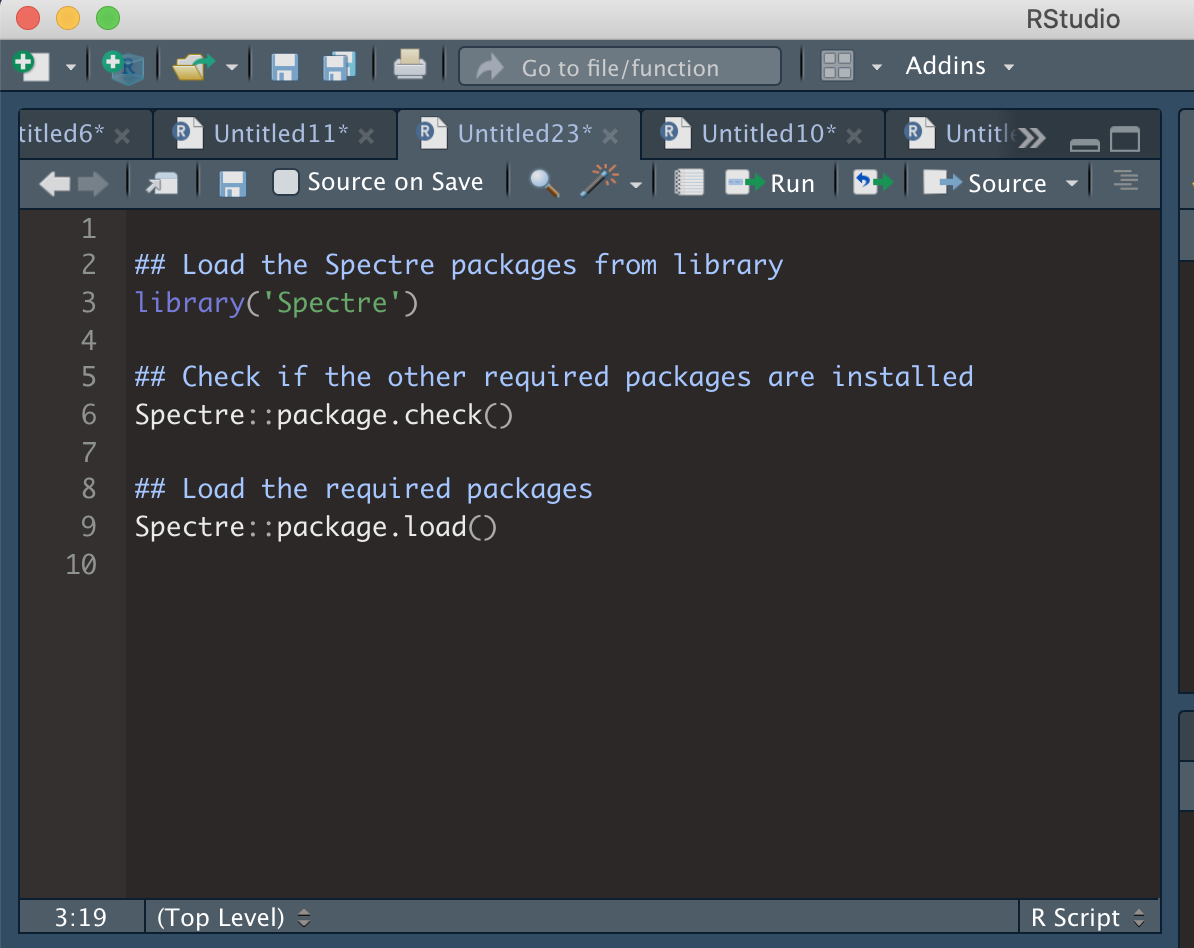 - In RStudio, create a new R Script file (.R) called “MyScript” and save it in the folder you just created (Spectre demo).