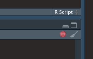 As the clustering is running, you will see the following red button show up on your RStudio window. That means that RStudio is in the middle of processing something, and it won’t respond to other commands while it is working.