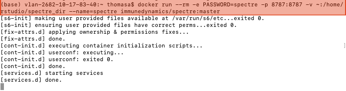 docker run --rm -e PASSWORD=spectre -p 8787:8787 -v ~:/home/rstudio/spectre_dir --name=spectre immunedynamics/spectre:master