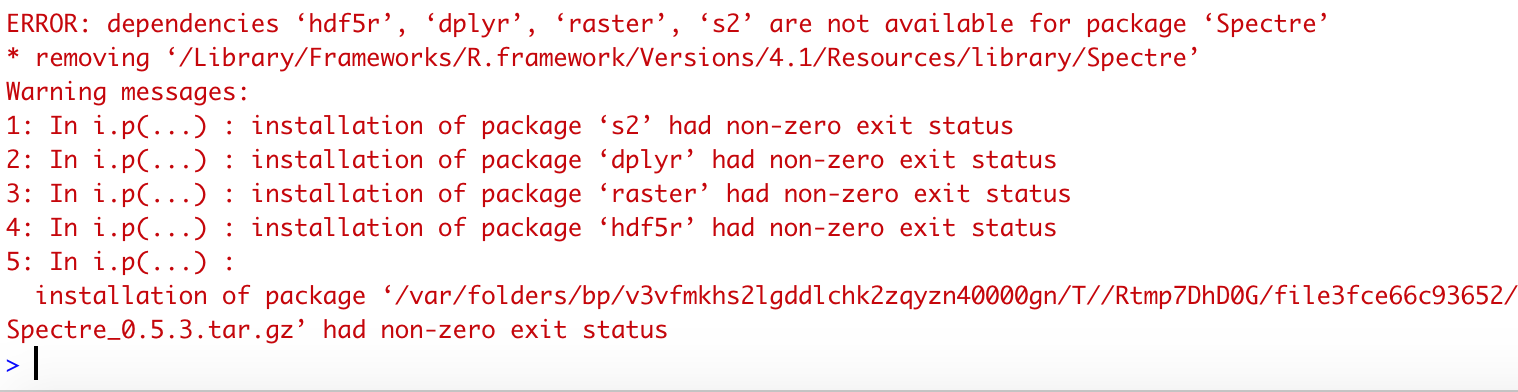 If Spectre or any of the dependencies was not installed successfully, you may see some error messages like the following.