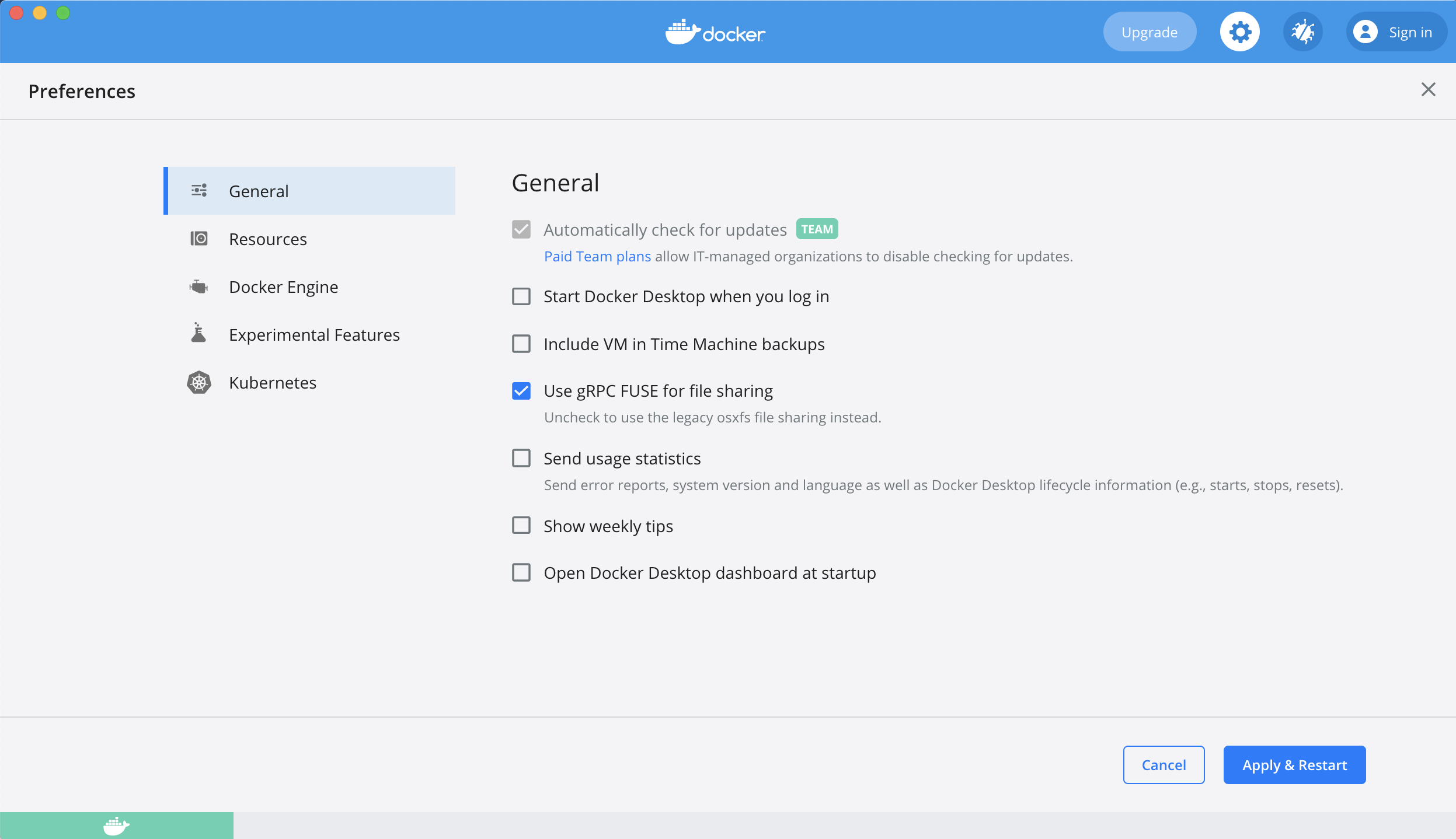 Click the gears icon to open ‘preferences’. Make sure you untick the options in General to mimic the screenshot below. This is to ensure Docker doesn’t start when you boot your computer, and it doesn’t share your usage data to Docker by default. Leave the automatic update checked if you prefer it to check for updates regularly.
